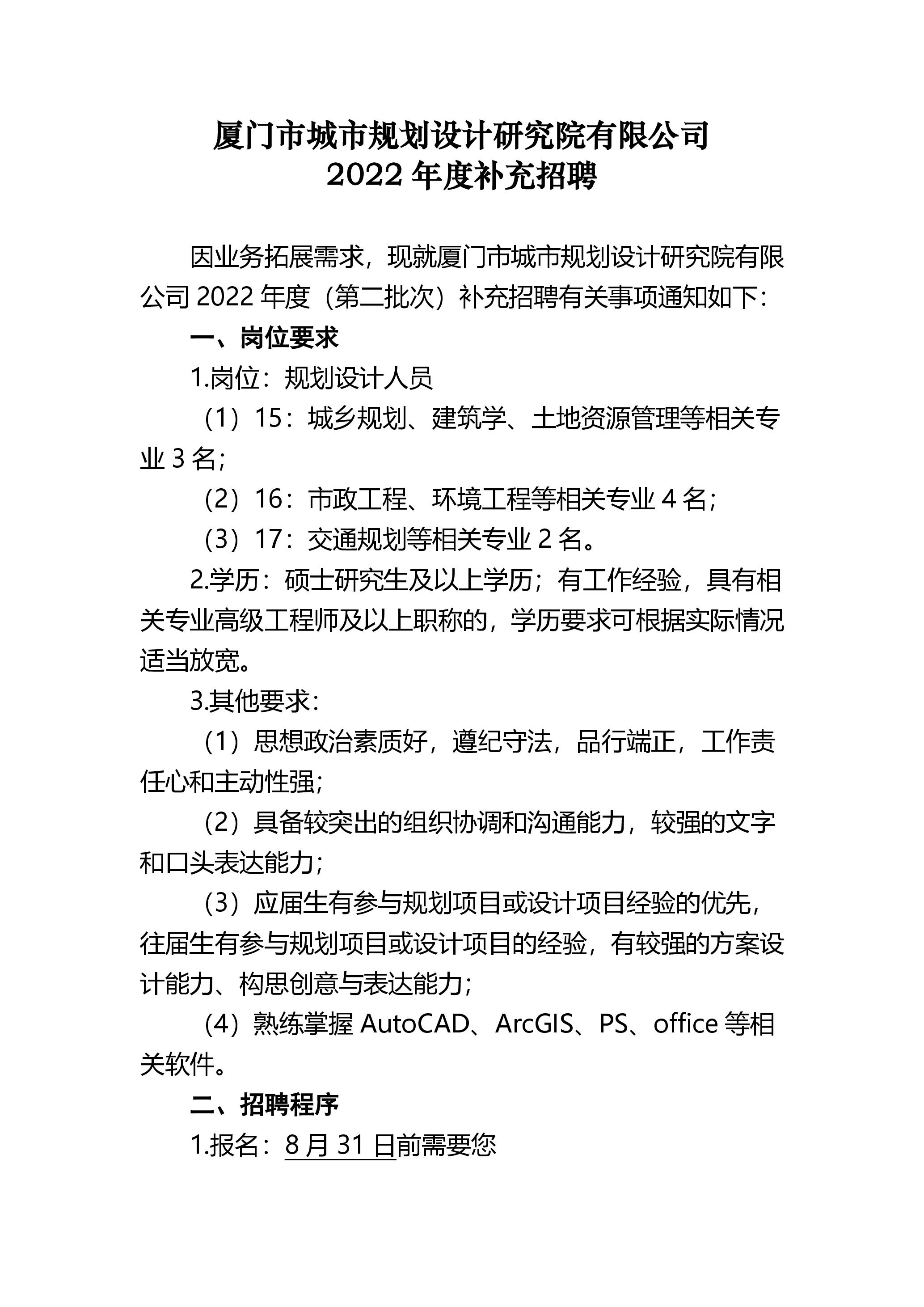 廈門市城市規(guī)劃設(shè)計研究院有限公司 2022年度補充招聘